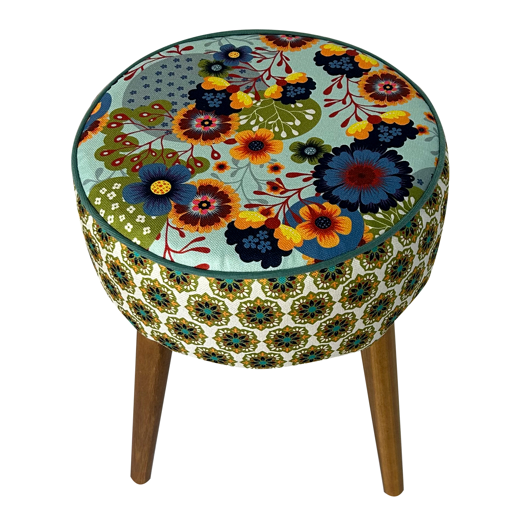 Banqueta redonda Frida estampada, em tecido veludo 100% poliester. Estampa exclusiva da designer Renata Sader.