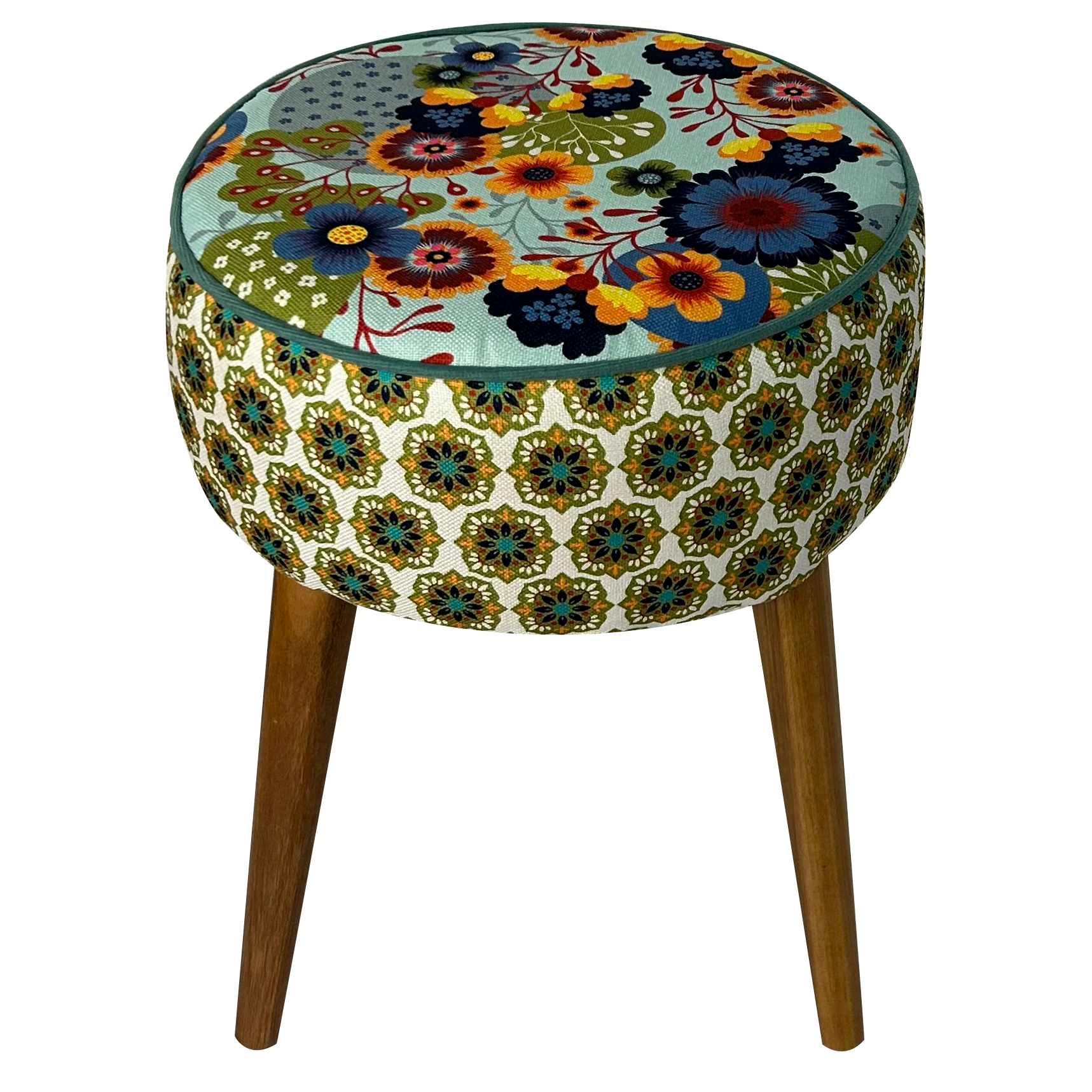 Banqueta redonda Frida estampada, em tecido veludo 100% poliester. Estampa exclusiva da designer Renata Sader. O processo de impressão digital, ressalta as cores vivas e o toque aveludado do tecido. Pés de madeira pinus tratada, envernizados na cor mel. Além do conforto e utilidade, a peça agrega estilo e personalidade ao decor. A espuma D28, de alta densidade, garante a durabilidade e o conforto.