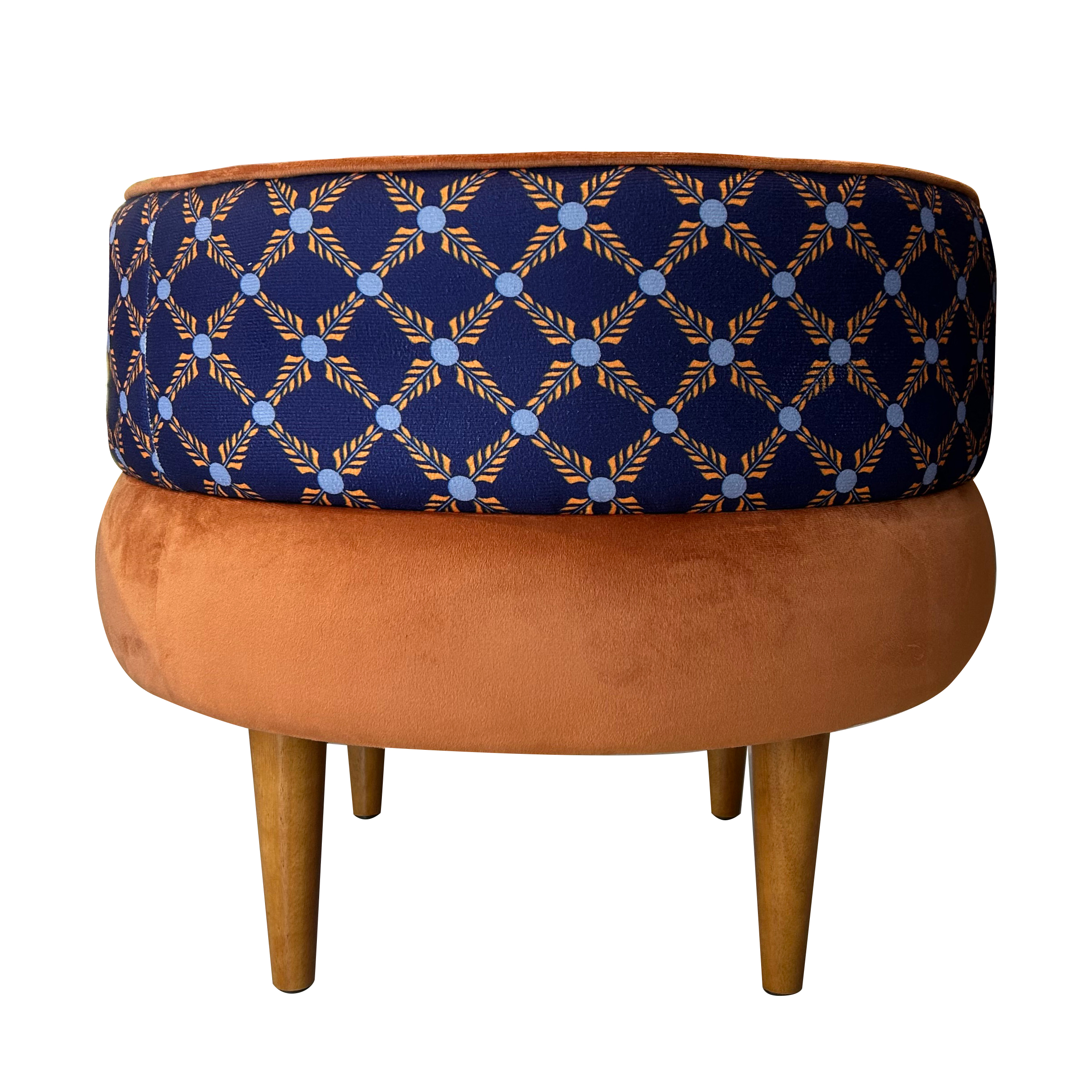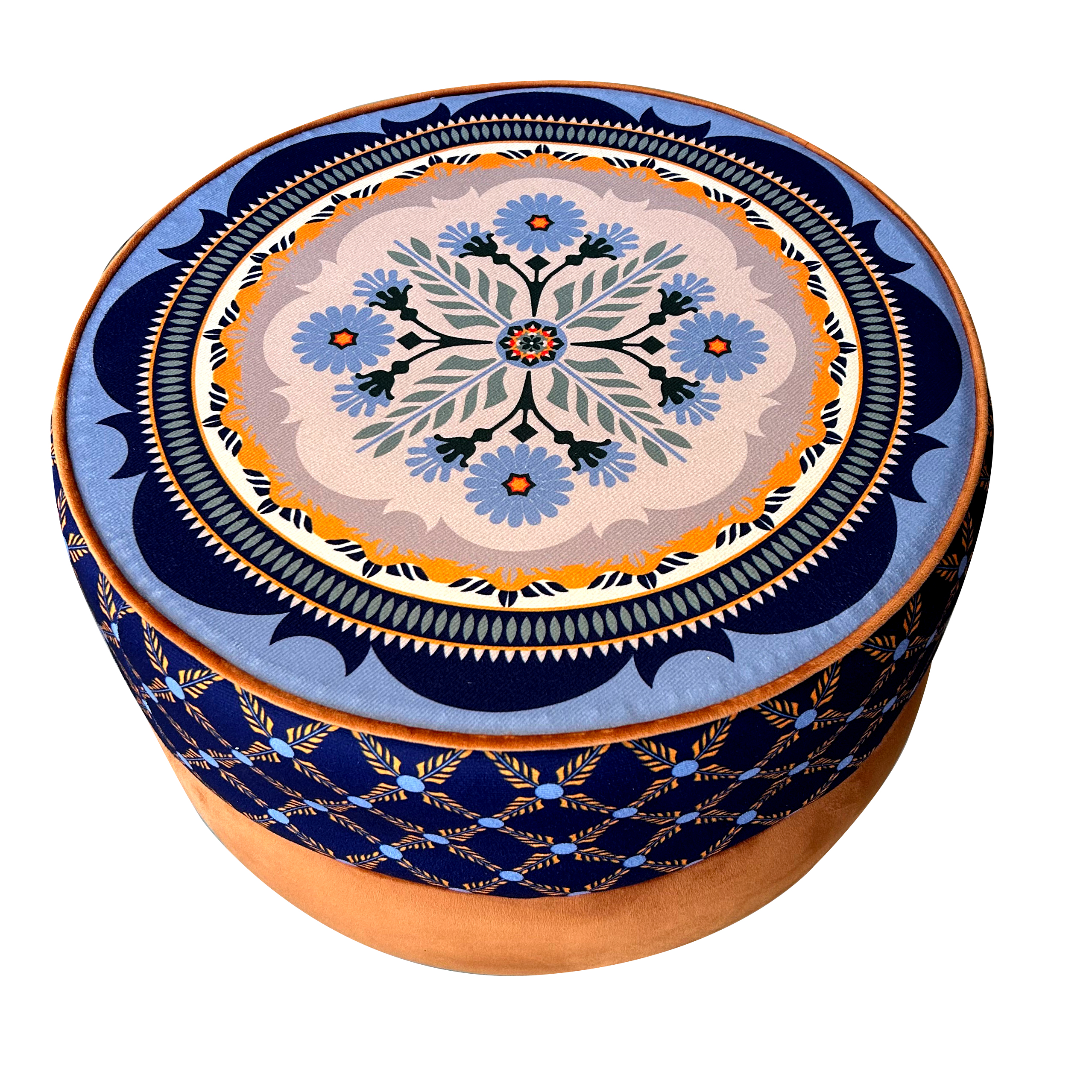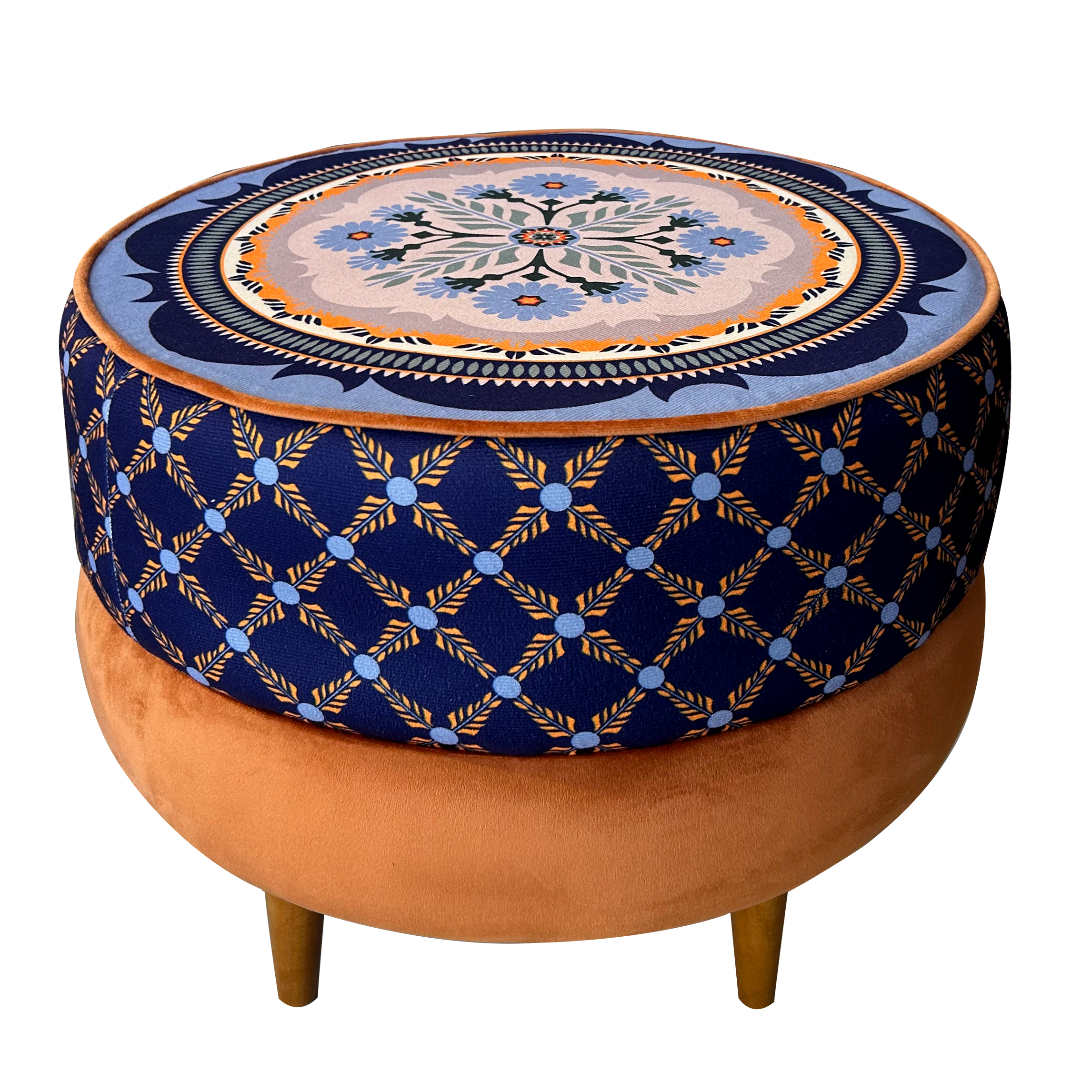 Puff redondo estampado, em tecido veludo 100% poliester. Estampa exclusiva da designer Renata Sader. O processo de impressão digital, ressalta as cores vivas e o toque aveludado do tecido. Pés palito de madeira pinus tratada, envernizados na cor mel. Além do conforto e utilidade, a peça agrega estilo e personalidade ao decor. A espuma D28, de alta densidade, garante a durabilidade e o conforto.