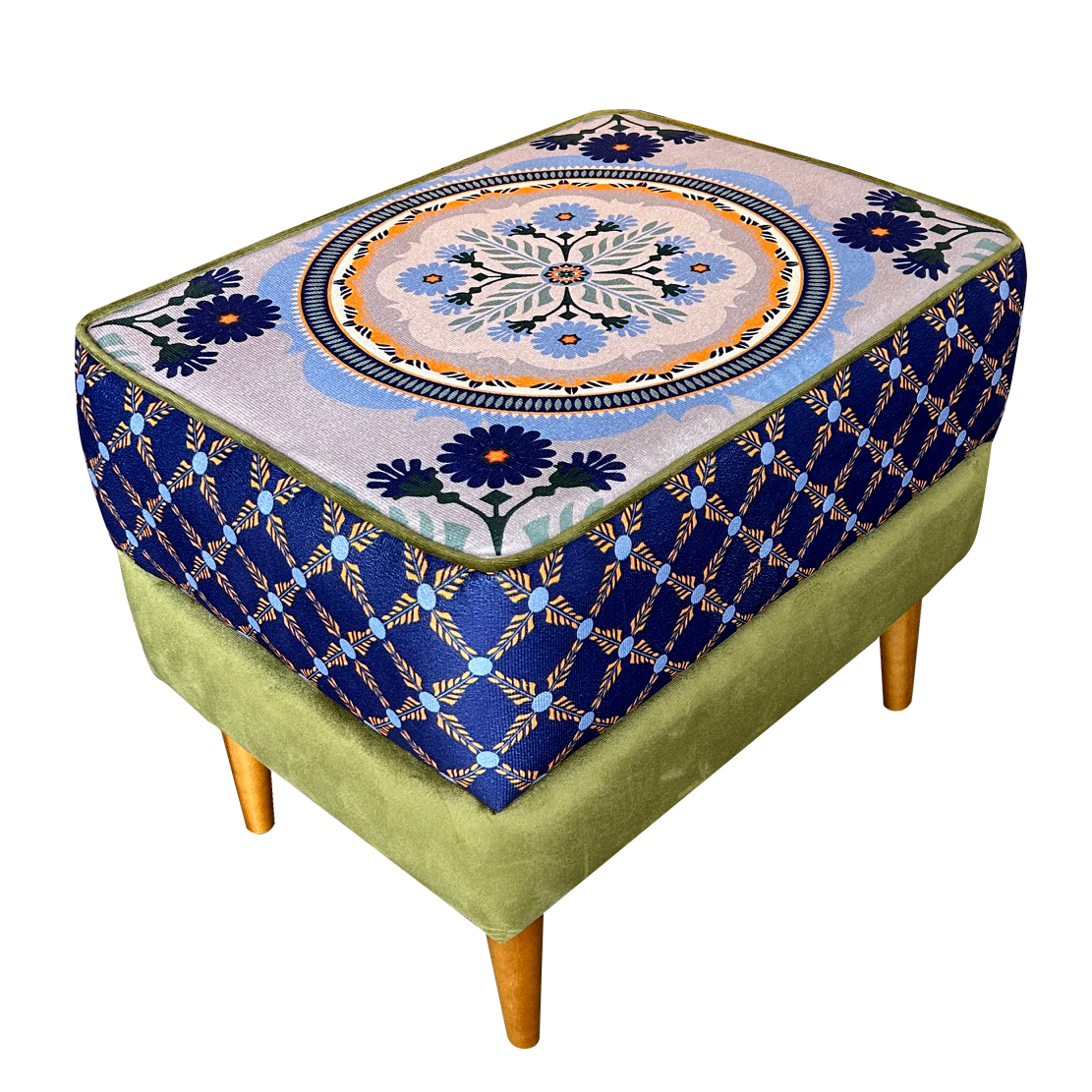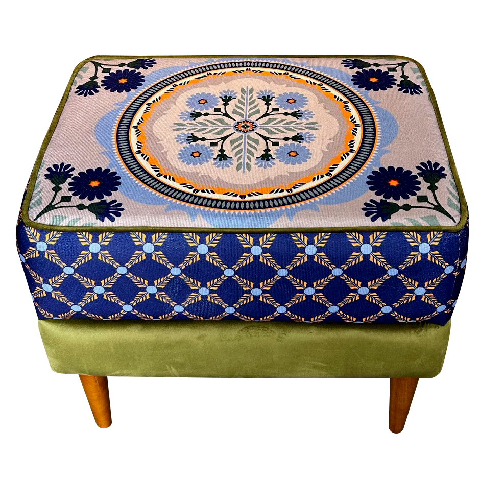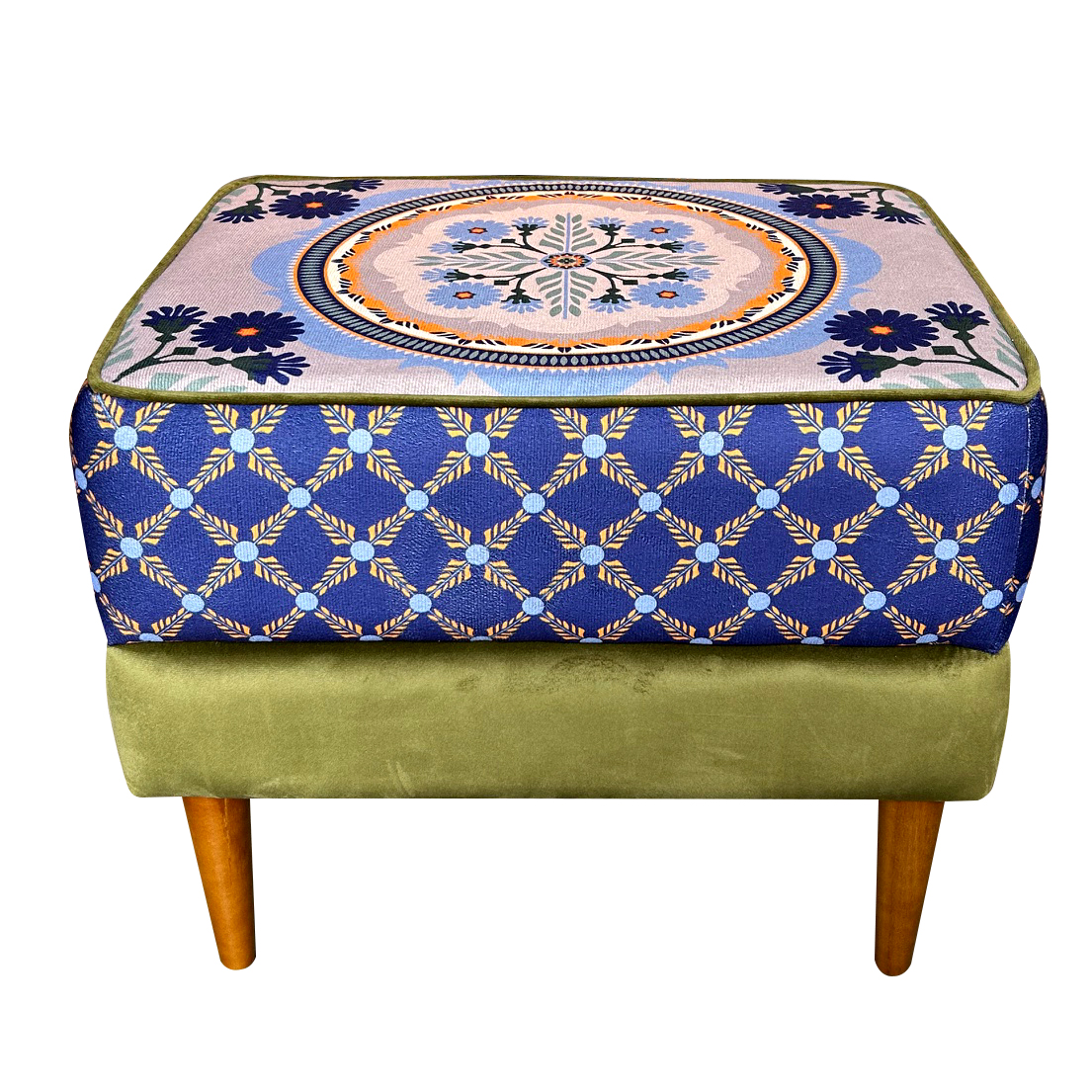 Puff retangular estampado, em tecido veludo 100% poliester. Estampa exclusiva da designer Renata Sader. O processo de impressão digital, ressalta as cores vivas e o toque aveludado do tecido. Pés palito de madeira pinus tratada, envernizados na cor mel. Além do conforto e utilidade, a peça agrega estilo e personalidade ao decor. A espuma D28, de alta densidade, garante a durabilidade e o conforto.